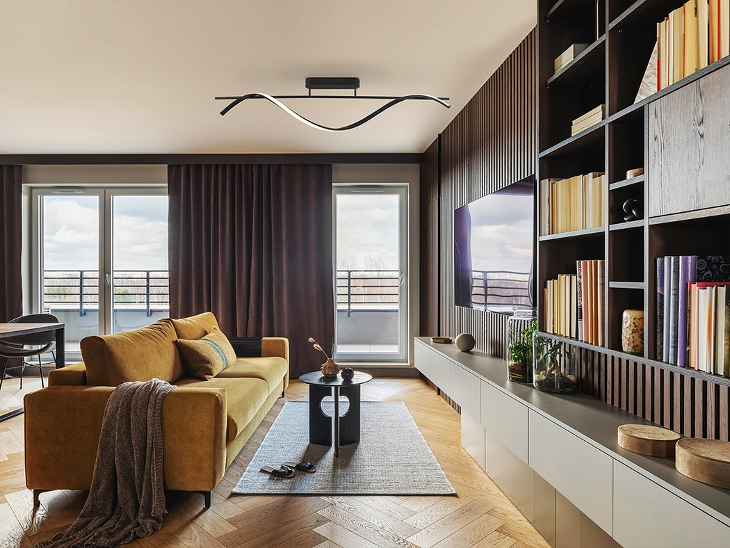 Além de destacar a decoração, o candeeiro de teto boa proporciona uma iluminação envolvente que realça áreas de convívio e relaxamento. A sua presença contribui para uma atmosfera acolhedora que convida a momentos de leitura ou convívio com família e amigos. O suporte discreto no tecto mantém o olhar centrado na peça, transformando o candeeiro numa verdadeira peça de design.