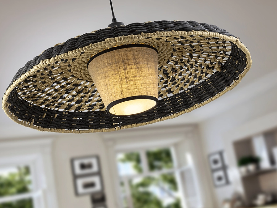 Candeeiro de 1 luz realizado em metal com acabamento preto. Abajur duplo: exterior de corda de papel entrançado em combinado bege e preto, abajur interior em tecido.