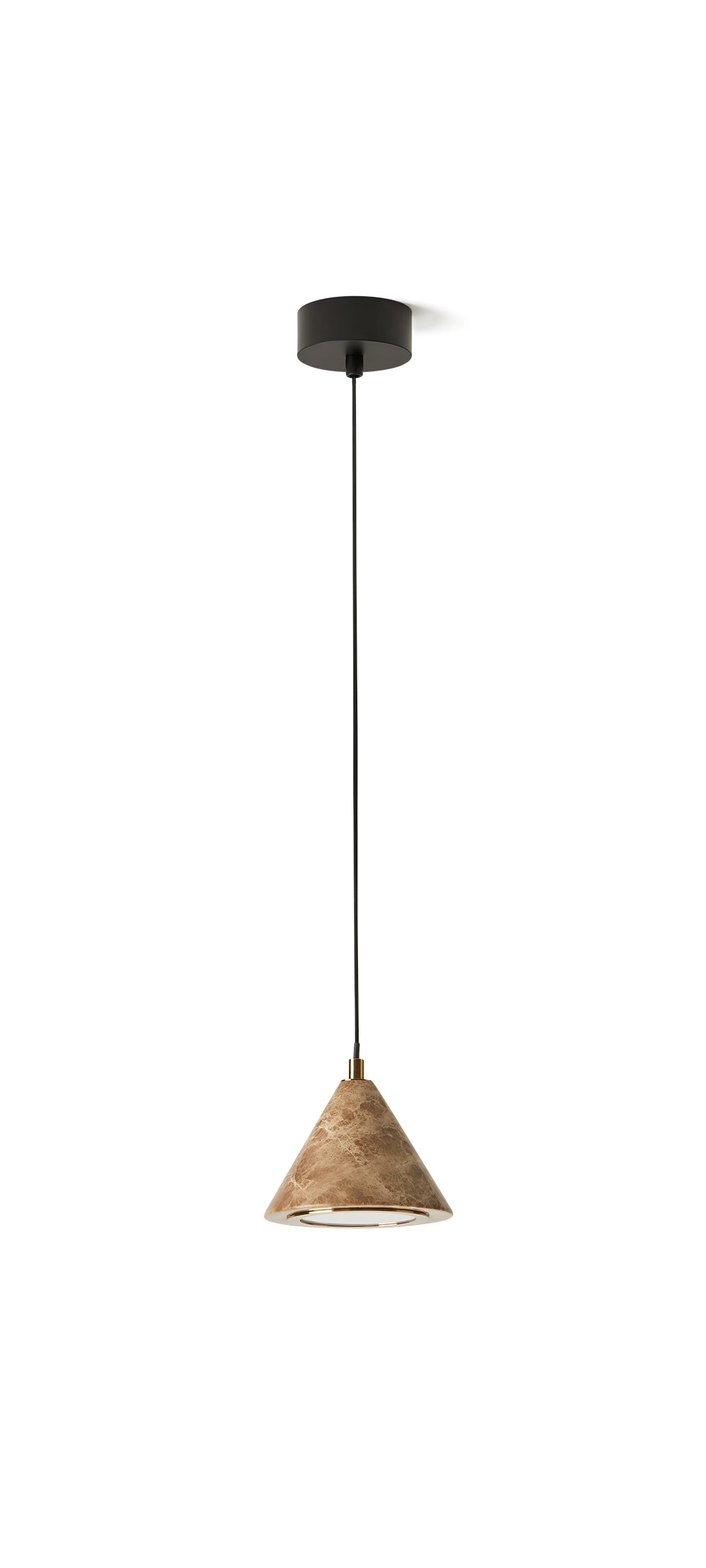 O Candeeiro Suspenso Iconic tem o seu cone fabricado em Mármore castanho, com pormenor metálico dourado.