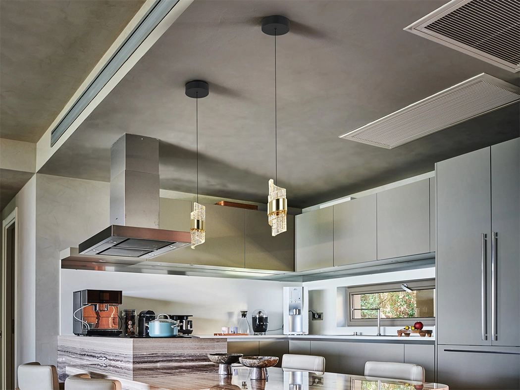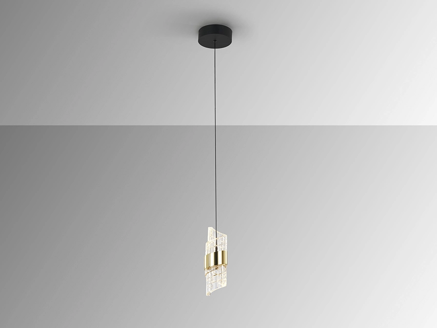 Candeeiro de 1 luz LED. Realizado em metal, acabamento preto mate e dourado brilhante. Abajur com design em espiral, realizado em acrílico moldado e esculpido.