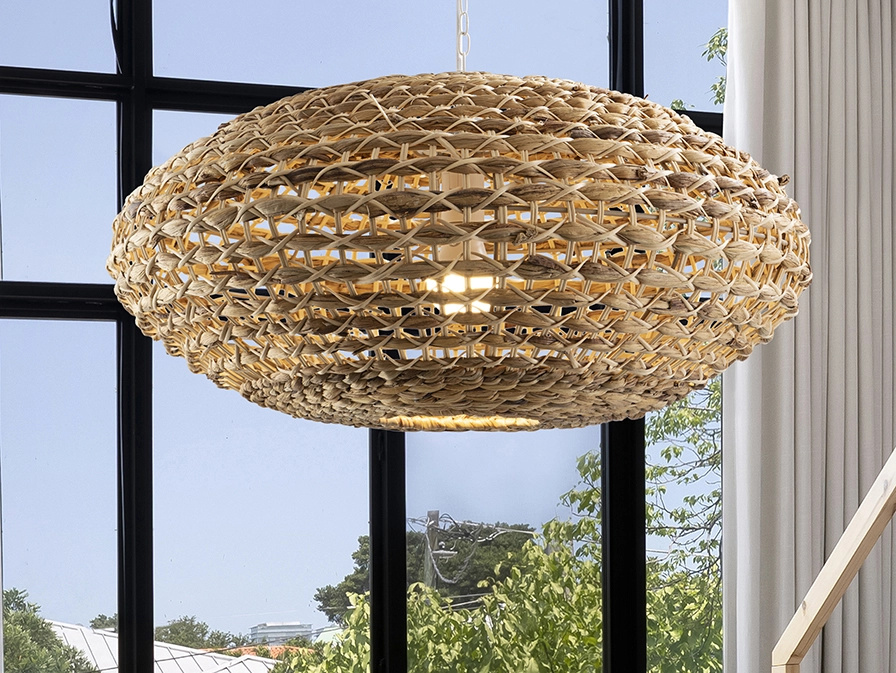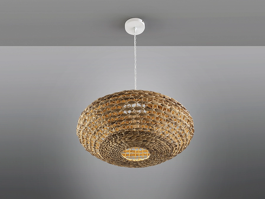Candeeiro de 1 luz realizado em metal com acabamento branco. Abajur em fibra de rattan e jacinto de água entrançado, com acabamento natural.