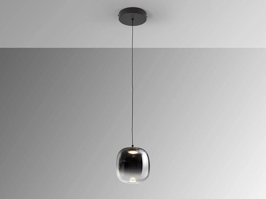 Candeeiro de 1 luz realizado em metal acabamento preto mate. Abajur de vidro soprado, acabamento cinzento smoke, esfumado a transparente.