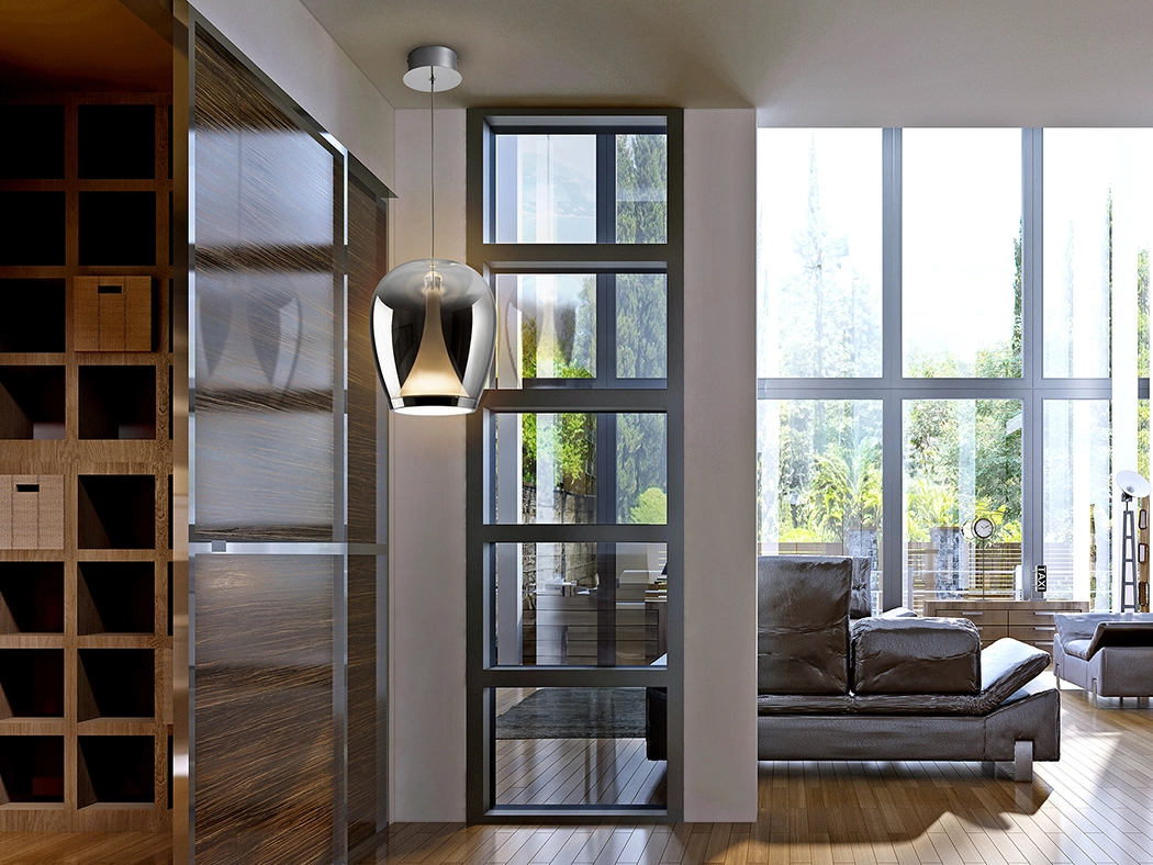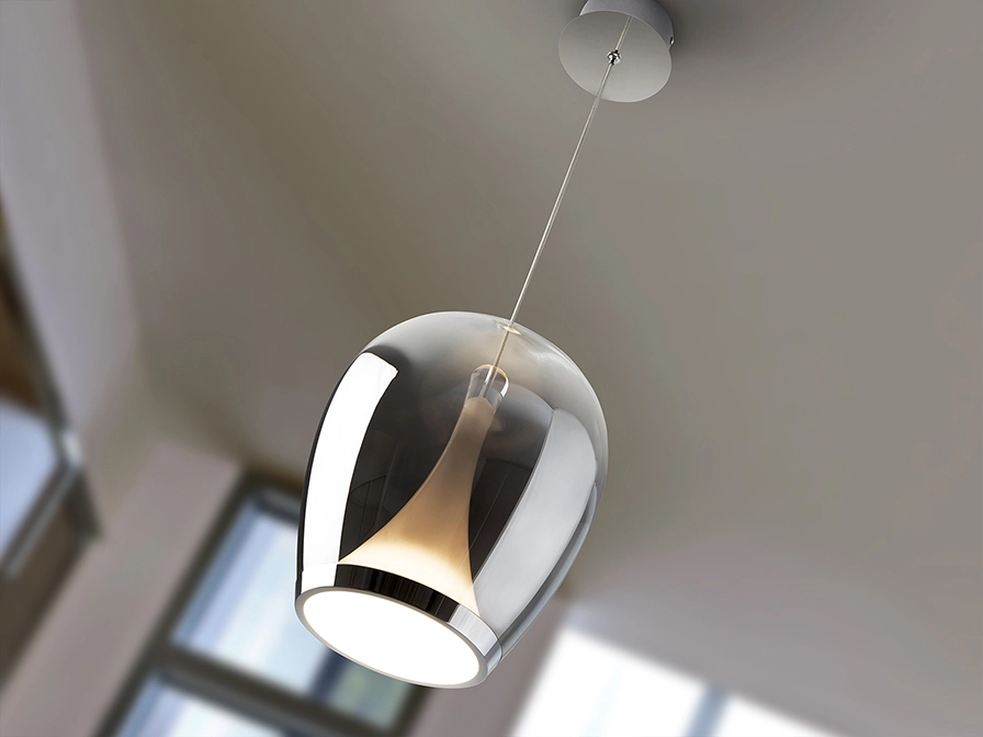 Candeeiro realizado em alumínio cromado, com abajur de vidro soprado com acabamento smoke ou âmbar degradê e difusor interior opalino.