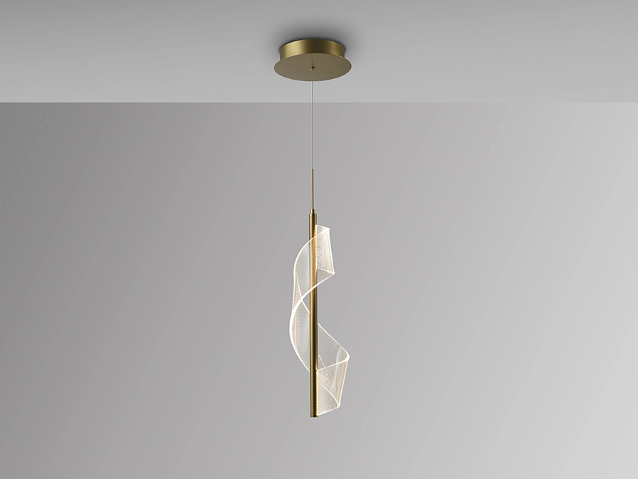 Candeeiro realizado em metal e alumínio, acabamento dourado mate. Difusor de metacrilato microimpresso curvado.