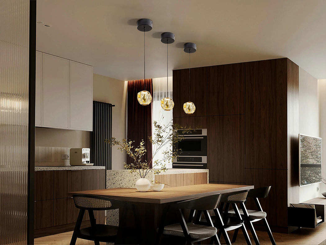 Candeeiro de 1 luz realizado em metal com acabamento preto mate, com detalhes em bronze e abajur de acrílico âmbar.