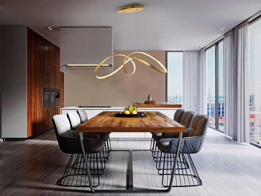 Na sala de jantar o ideal é que fique centrado sobre a mesa de jantar. A altura correta é crucial: cerca de 75 a 90 cm acima do tampo da mesa para não bloquear a visão nem encandear.