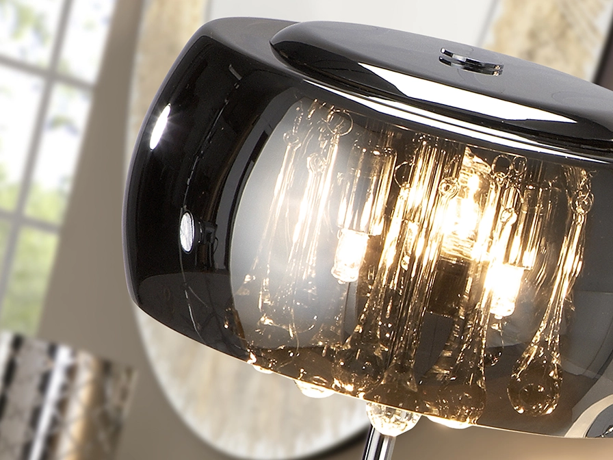 Candeeiro de mesa, realizado em metal acabamento crómio. Tulipa de vidro espelhado e lágrimas interiores de vidro tipo murano.