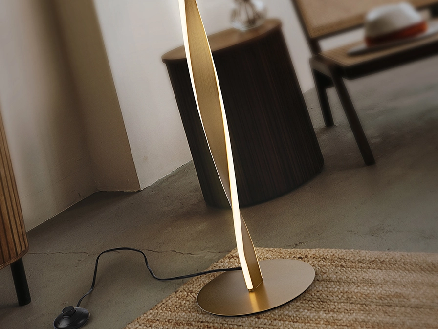 O candeeiro de pé Twist combina forma e função com um design torcido que capta o olhar e distribui luz suave pelo ambiente. O acabamento dourado confere um toque sofisticado que realça a sala de estar e cantos de leitura sem ocupar muito espaço. A sua silhueta esguia cria um efeito escultórico que acrescenta personalidade mantendo a sensação de leveza. Perfeito para criar uma atmosfera acolhedora e destacar elementos de decoração, integra facilmente em interiores contemporâneos e minimalistas. Uma solução prática para iluminar zonas de convívio com estilo e elegância.