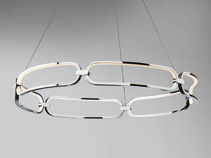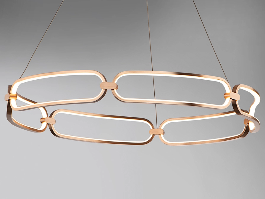Na sala de jantar o ideal é que fique centrado sobre a mesa de jantar. A altura correta é crucial: cerca de 75 a 90 cm acima do tampo da mesa para não bloquear a visão nem encandear.