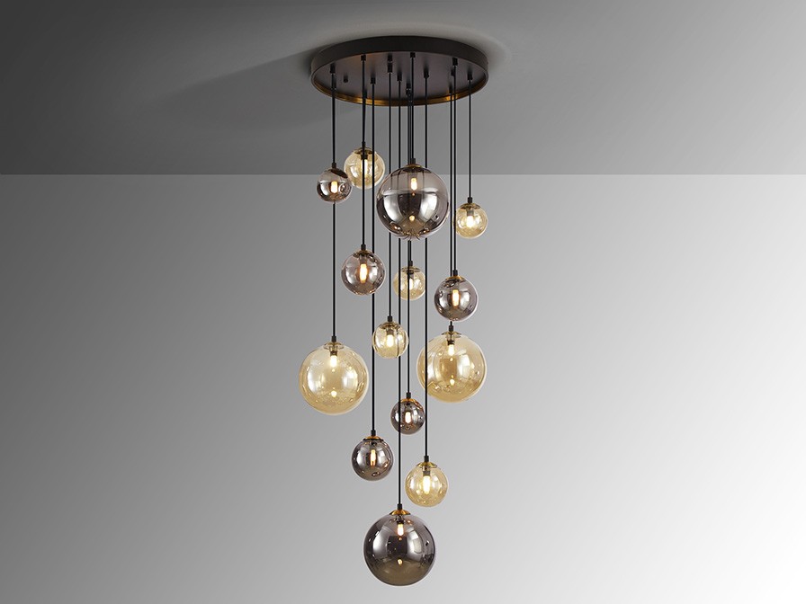 Abajures de vidro esféricos de 10, 12 e 20 cm, com acabamentos âmbar e cinzento smoke espelhado. Regulável em altura.Lâmpadas: 14 x G9 LED 3.5W (incluído)