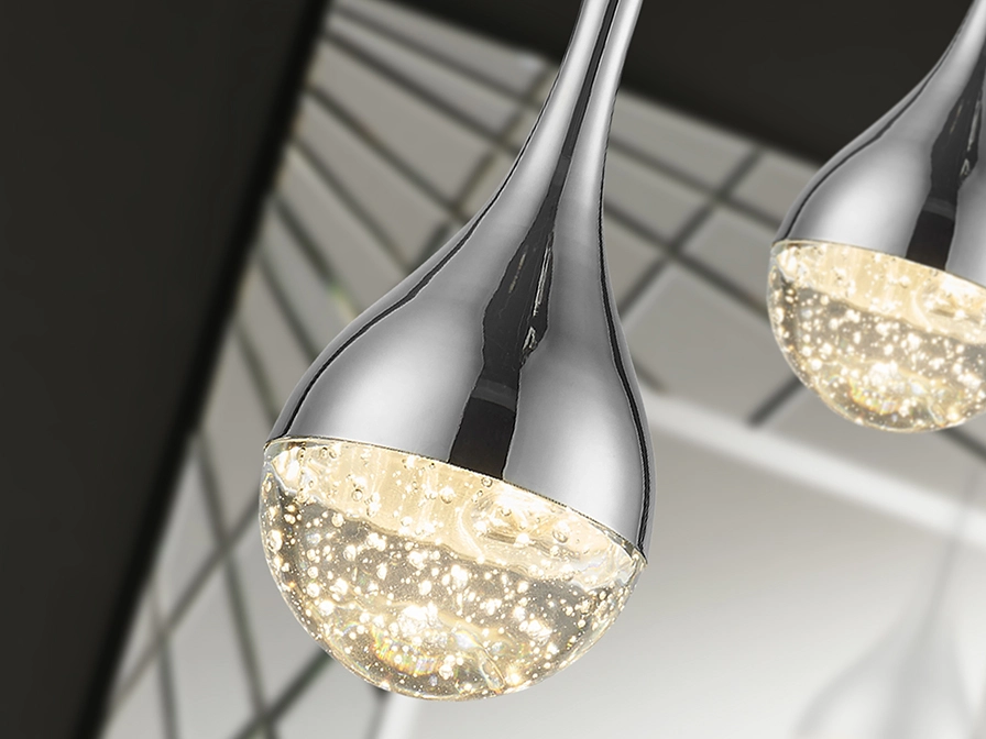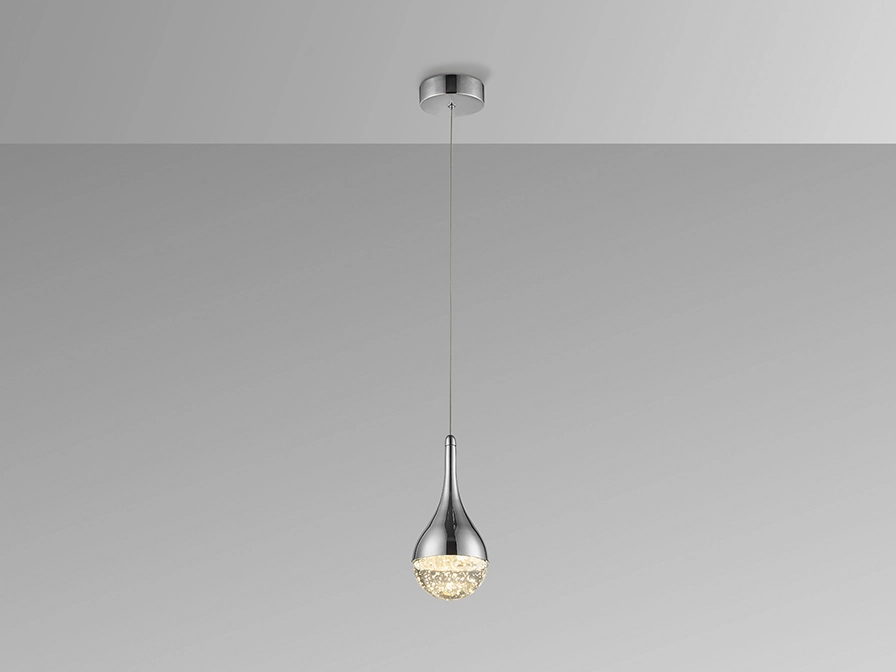 Candeeiro de 1 luz LED, em metal, acabamento crómio. Tulipa em forma de gota realizada em vidro maciço com bolhas decorativas no seu interior.