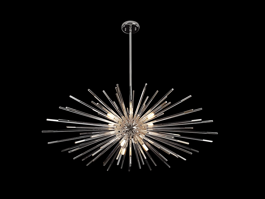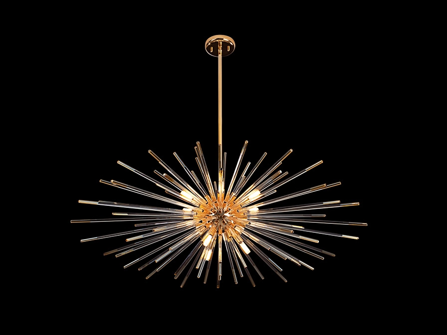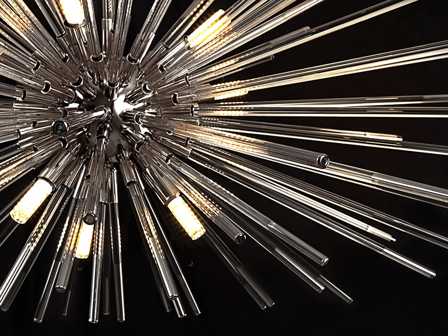 Varetas radiais de vidro transparente com as pontas decoradas banhadas a crómio escuro ou âmbar.