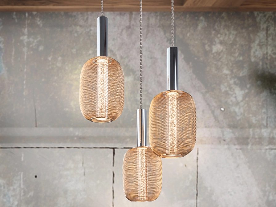 Na sala de jantar o ideal é que fique centrado sobre a mesa de jantar. A altura correta é crucial: cerca de 75 a 90 cm acima do tampo da mesa para não bloquear a visão nem encandear.