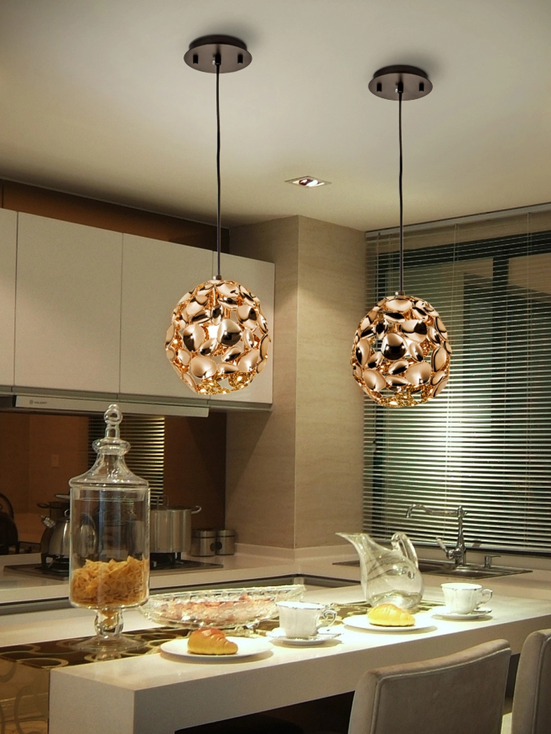 Cozinha sobre a ilha ou bancada, pode instalar um ou mais candeeiros pendentes para iluminação de tarefa.