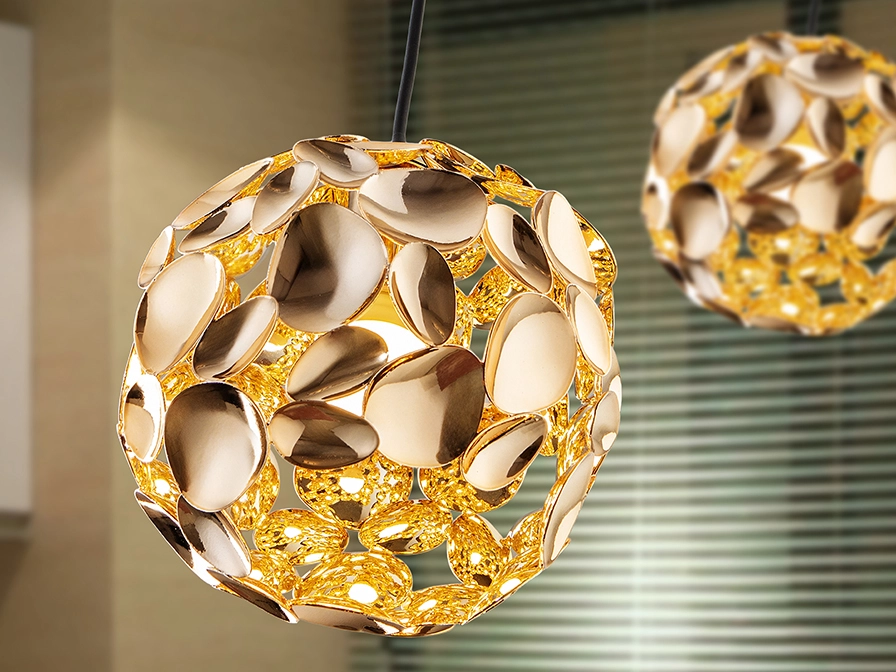 O candeeiro de teto narisa dourado acrescenta um toque de sofisticação a qualquer divisão. Com um acabamento metálico dourado e um design esférico composto por elementos reflexivos transforma a luz em padrões acolhedores que valorizam superfícies e cria atmosfera intimista. Suspenso por um cabo discreto passa a ser ponto focal sobre mesas de jantar ilhas de cozinha ou entradas e combina com estilos contemporâneos e sofisticados. Ideal para quem procura aliar funcionalidade e estética o candeeiro narisa destaca a decoração enquanto oferece uma iluminação elegante e convidativa.