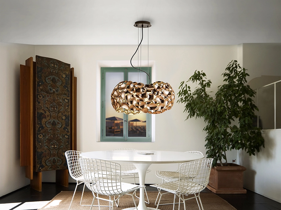 Na sala de jantar o ideal é que fique centrado sobre a mesa de jantar. A altura correta é crucial: cerca de 75 a 90 cm acima do tampo da mesa para não bloquear a visão nem encandear.