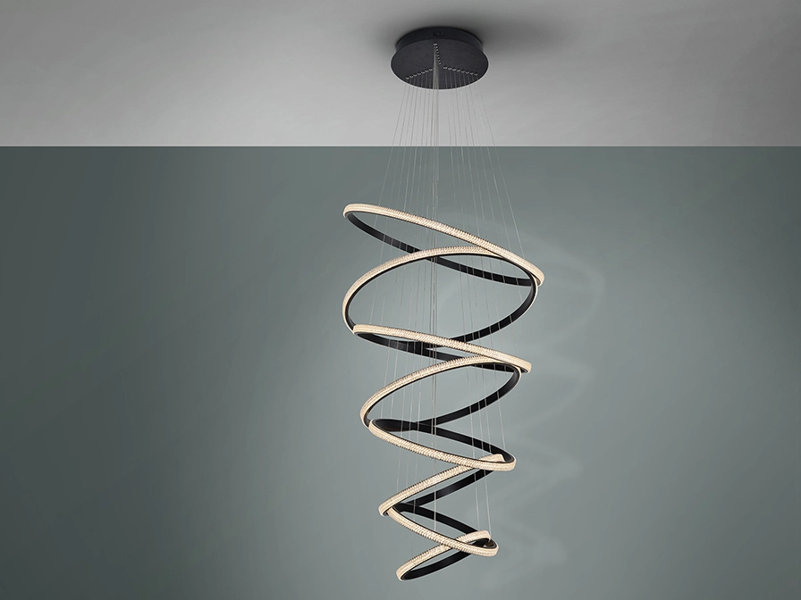 Candeeiro em metal e alumínio acabamento preto mate arenado. Oito aros, reguláveis em altura, com difusor de peças de acrílico transparente.
