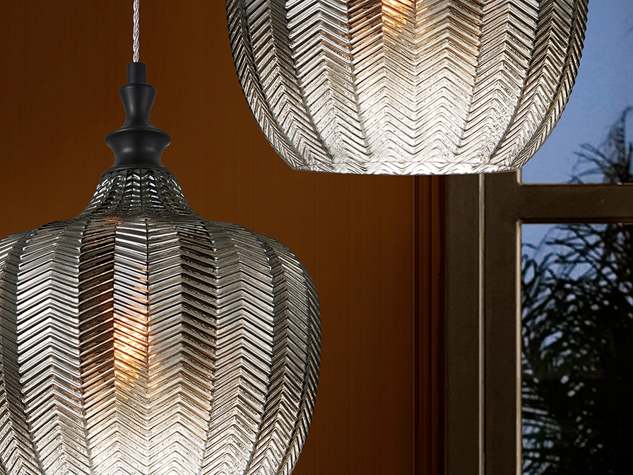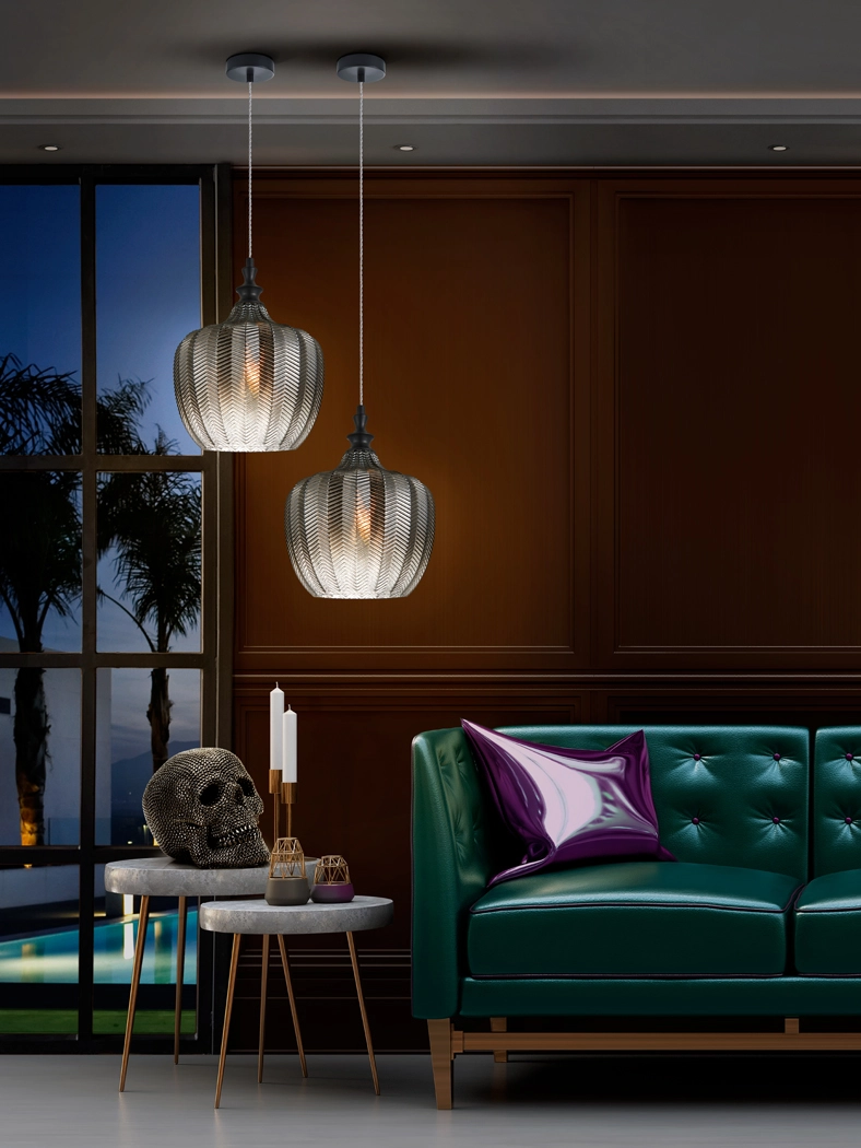 Candeeiro de 1 luz realizado em metal acabamento preto mate. Tulipa com gravação de espiga e tom cinzento smoke espelhado, com degradé a transparente.