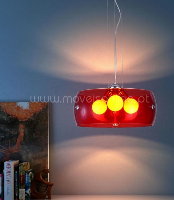 O candeeiro de teto Titan transforma qualquer divisão num ponto de destaque. O aro exterior vermelho translúcido envolve três lâmpadas que projectam uma iluminação envolvente e padrões de luz atraentes no tecto e nas paredes. O acabamento cromado acrescenta um toque contemporâneo e os fios de suspensão mantêm a presença leve e elegante. Perfeito para salas de estar, zonas de refeições ou cozinhas, valoriza a decoração e cria uma atmosfera acolhedora, ideal para convívio ou momentos relaxantes. Fácil de integrar em ambientes modernos, proporciona estilo e funcionalidade sem ocupar superfície.