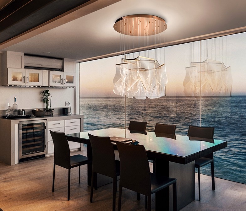 O candeeiro de teto velos transforma qualquer divisão numa sala acolhedora graças às camadas translúcidas que filtram a luz e criam um brilho suave e elegante. Ideal para salas de jantar, funciona como peça decorativa e ponto focal sem sobrecarregar o ambiente. A placa de tecto com acabamento que parece madeira realça a sensação quente e natural, permitindo uma integração fácil com estilos contemporâneos e náuticos. Proporciona conforto visual durante refeições e convívios, valorizando mesas e espaços de refeição com uma iluminação envolvente e sofisticada. Uma escolha estética que junta funcionalidade e charme.