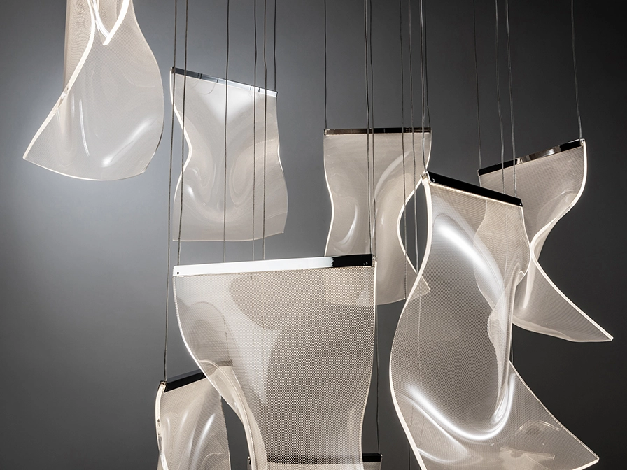 Candeeiro realizado em metal cromado, e tulipas de metacrilato microimpresso moldado.
