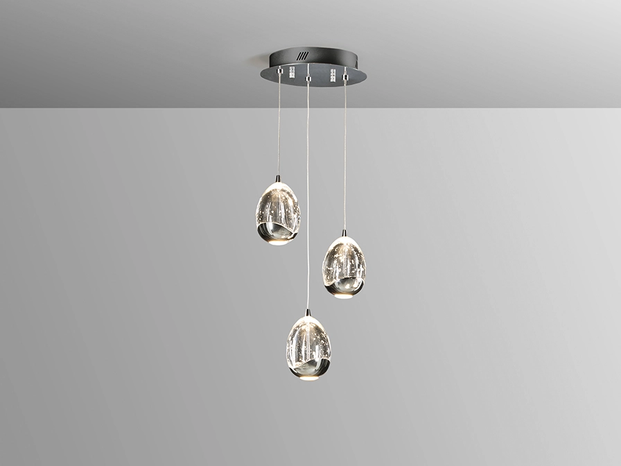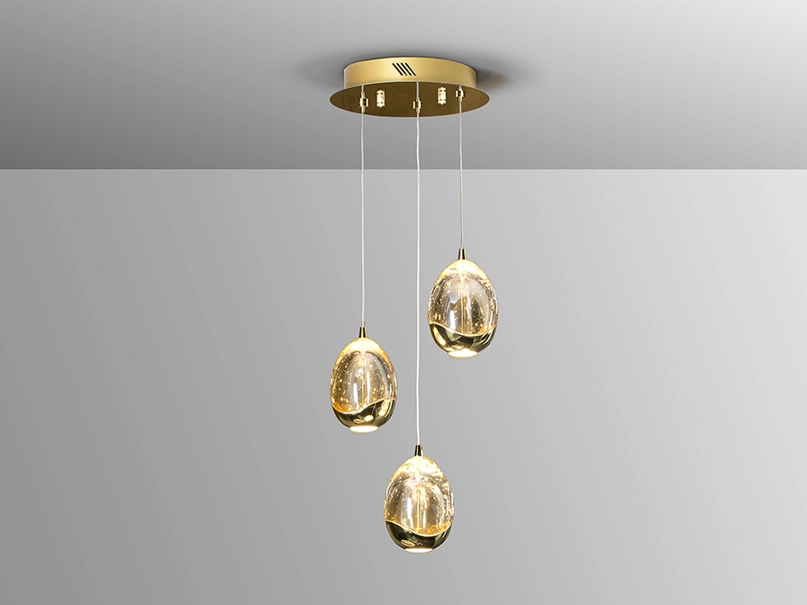 - Três pendentes em vidro com brilho refletido