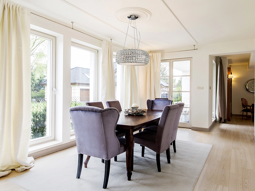 Na sala de jantar o ideal é que fique centrado sobre a mesa de jantar. A altura correta é crucial: cerca de 75 a 90 cm acima do tampo da mesa para não bloquear a visão nem encandear.