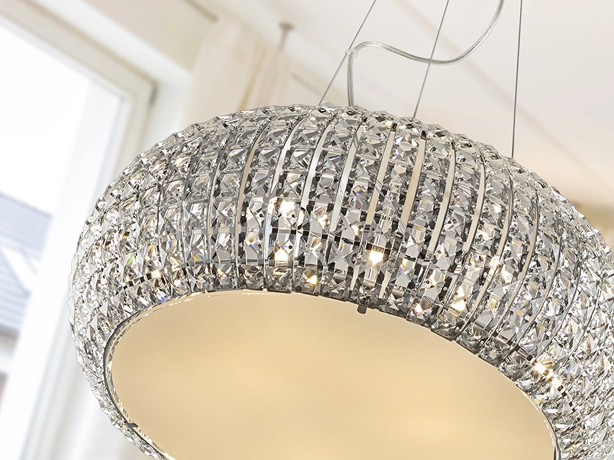 Candeeiro suspenso Diamond traz um toque de sofisticação a qualquer divisão. A cúpula circular revestida por cristais cria um efeito luminoso refinado que realça a decoração enquanto o difusor inferior garante uma luz suave e homogénea. Suspenso por cabos finos e com base metálica discreta combina com ambientes contemporâneos e clássicos, ideal para sala de jantar, sala de estar ou entrada. Este candeeiro destaca-se pela presença visual e capacidade de transformar espaços, criando uma atmosfera acolhedora e elegante que valoriza móveis e tons da casa.