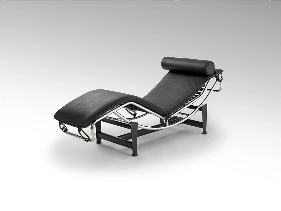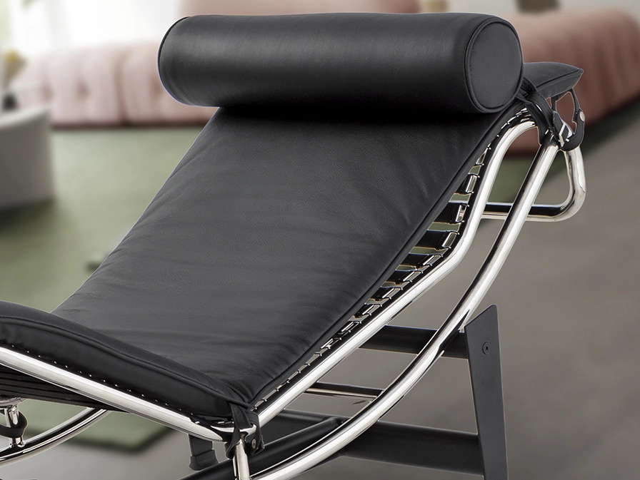 Chaise longue com estrutura em aço com acabamento cromado e base em metal com acabamento preto. Assento basculante estofado, na parte da frente, em pele preta e, na parte de trás, em napa.