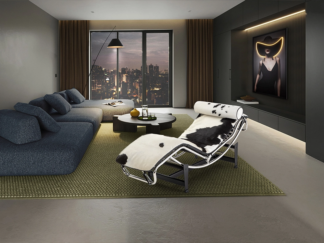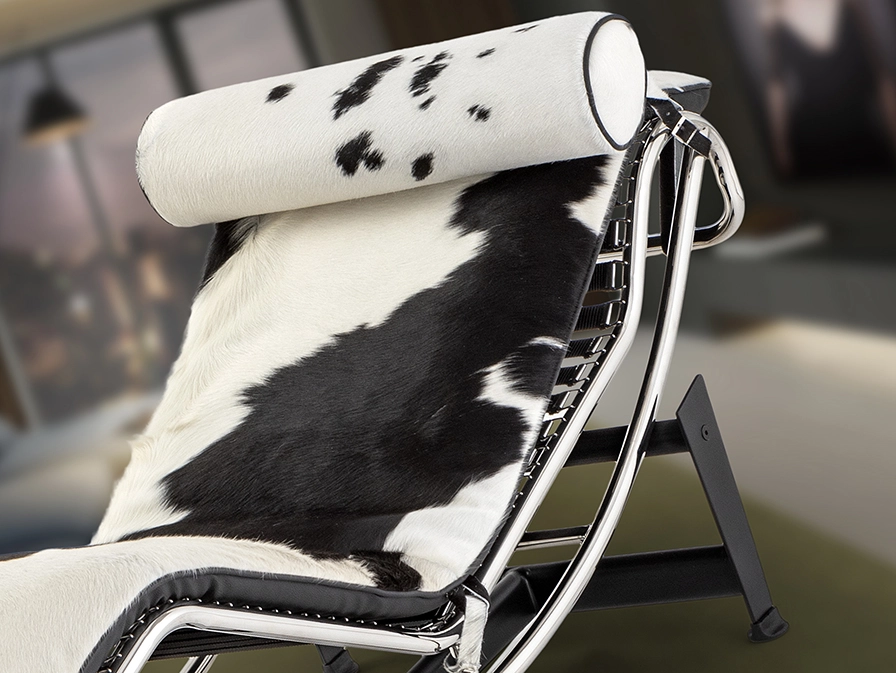 Chaise longue com estrutura em aço com acabamento cromado e base em metal com acabamento preto. Assento basculante estofado, na parte da frente, em pele de vaca natural com pelo em manchas preto e branco e, na parte de trás, em napa.
