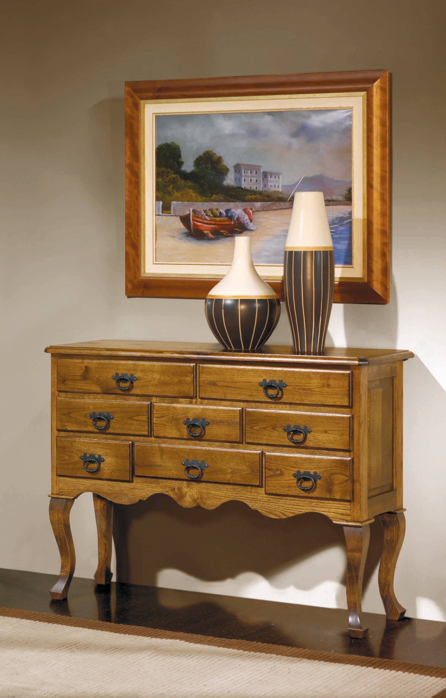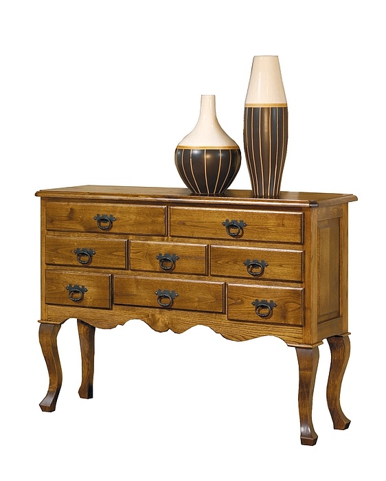 Dimensões: C 110 X L 40 X A 82 cm Materiais: Estrutura em madeira maciça de castanhoe tampo em aglomerado, folheado a castanho.Cómoda com oito gavetas.Este produto não requer montagem. Instruções de manutenção:Limpar com um pano seco.Para manchas, utilizar um pano húmidoe de seguida passar um pano seco.
