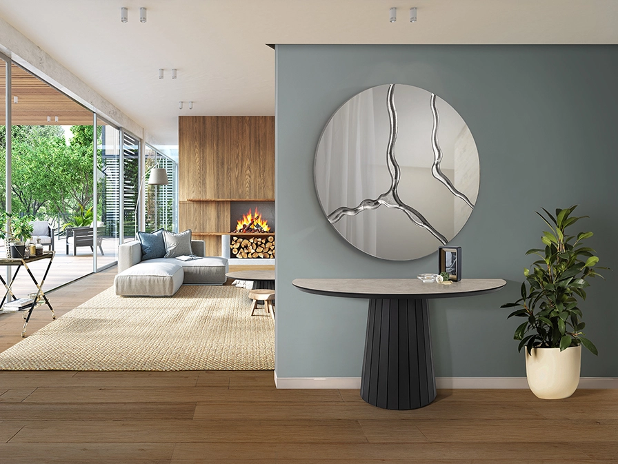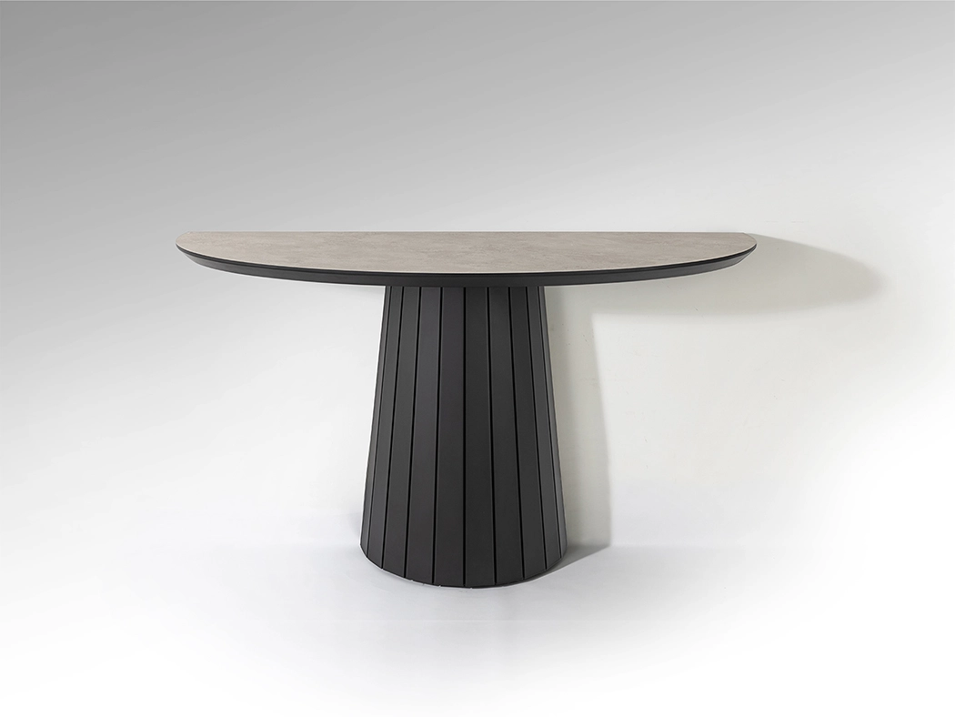 Consola, com tampo em melamina de alta resistência, acabamento pedra mate. Pés canelados em Preto mate.