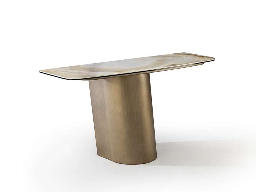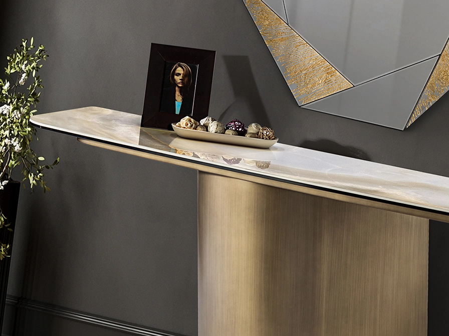 Consola fabricada em metal, acabamento latão escovado. Tampo laminado de porcelânico e vidro, com decoração mármore com veios.