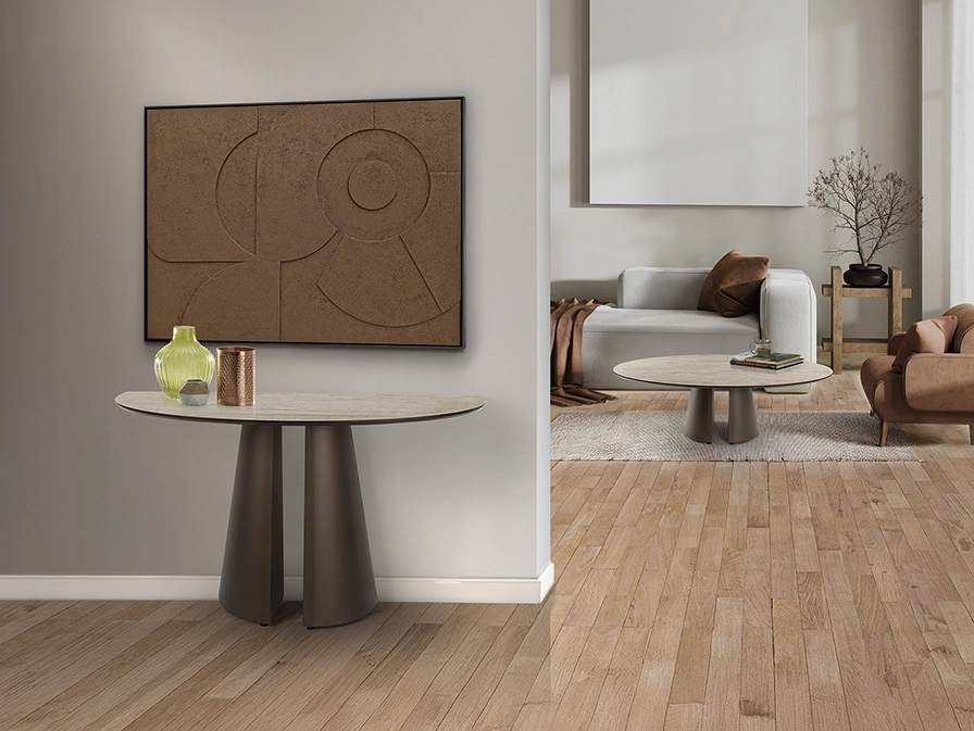 Consola, com tampo em melamina de alta resistência, acabamento travertino. Pés com acabamento castanho em metal e MDF