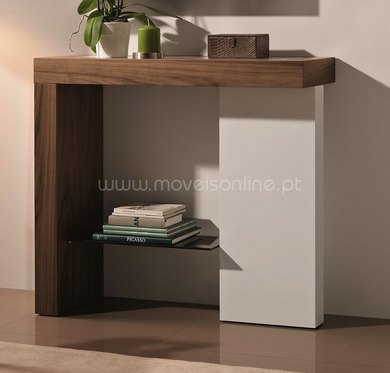 Consola com vidro embutido no tampo e prateleira de vidro.