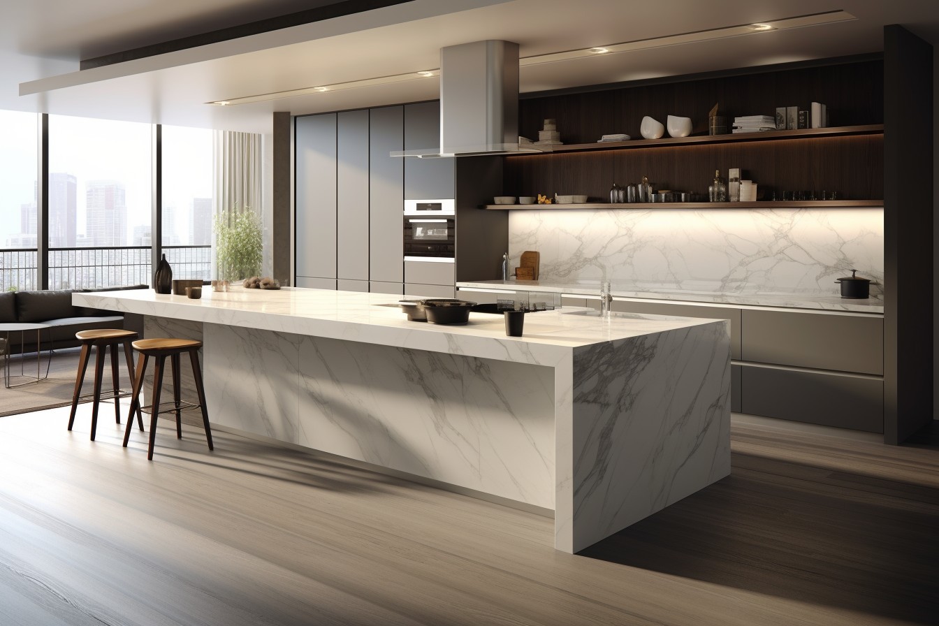 Cozinhas Arrabida conjuga design contemporâneo com funcionalidade para o dia a dia. A ilha central com bancada em efeito mármore oferece amplo espaço de preparação e pode servir de ponto de convívio enquanto cozinha. Armários cinzentos e prateleiras em madeira proporcionam arrumação inteligente e estética elegante mantendo tudo à mão. A parede com eletrodomésticos integrados e a coifa sobre a ilha tornam as tarefas mais eficientes e organizadas. A luz natural e a paleta suave criam ambiente acolhedor ideal para refeições e encontros. Uma solução prática e sofisticada para valorizar a sua casa.