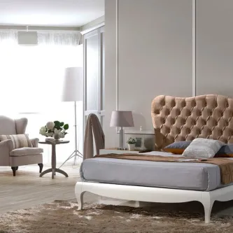 Quarto de casal Sado com cama de madeira, cabeceira estofada e aplique.