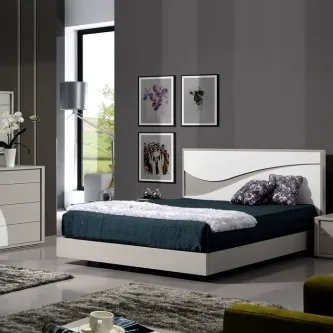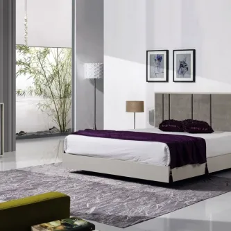 Quarto de casal Lorenzo com cama estofada, candeeiro pendente e cómoda branca