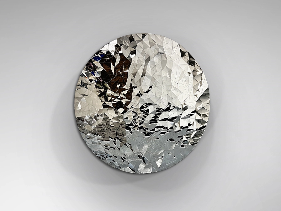 Baixo-relevo, realizado com chapas de aço inoxidável, formando uma grelha esférica de poliedros irregulares.