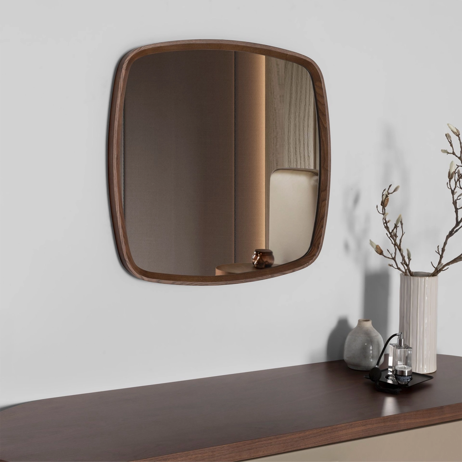 Espelho de parede quadrado de design moderno com moldura de madeira na cor nogueira.