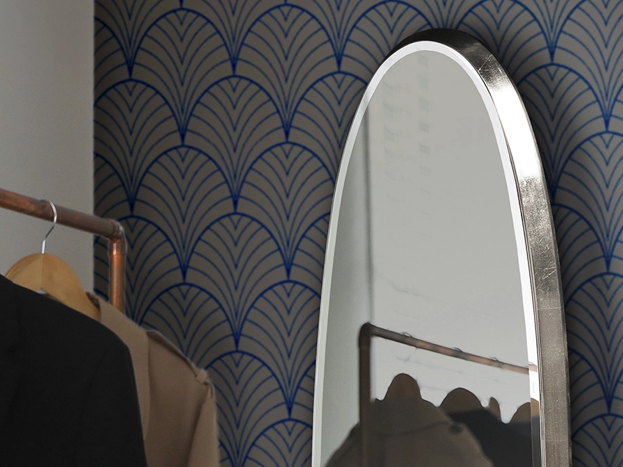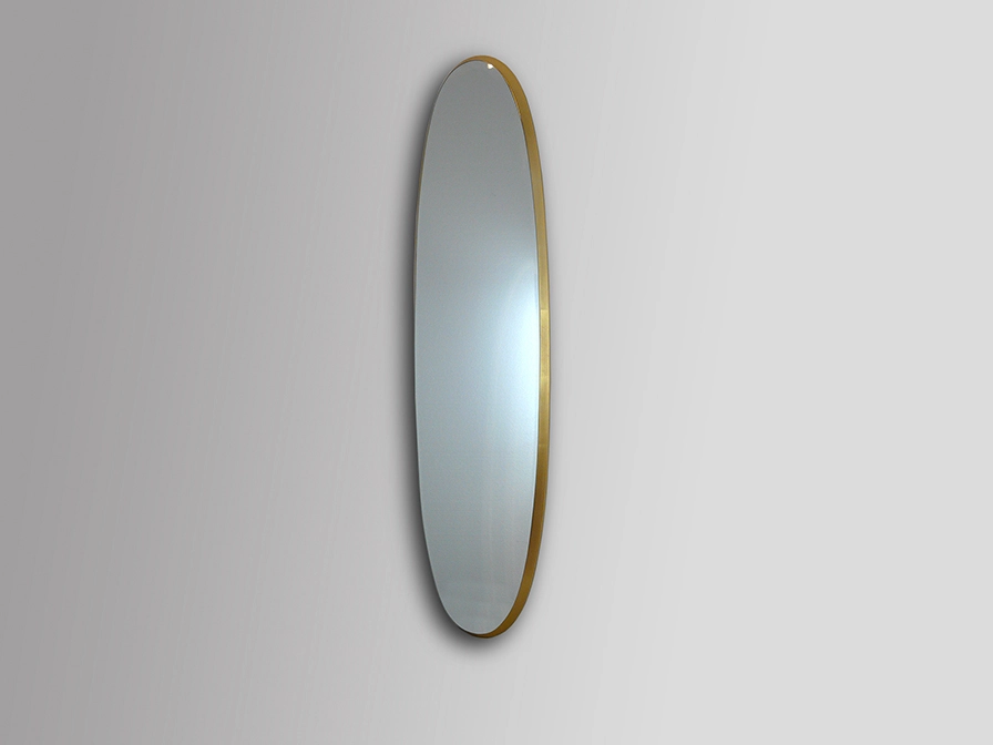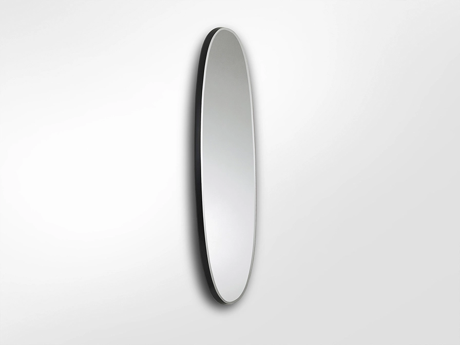 Espelho ovalado com moldura de DM com acabamento em folha de ouro ou prateada e preto acetinado.