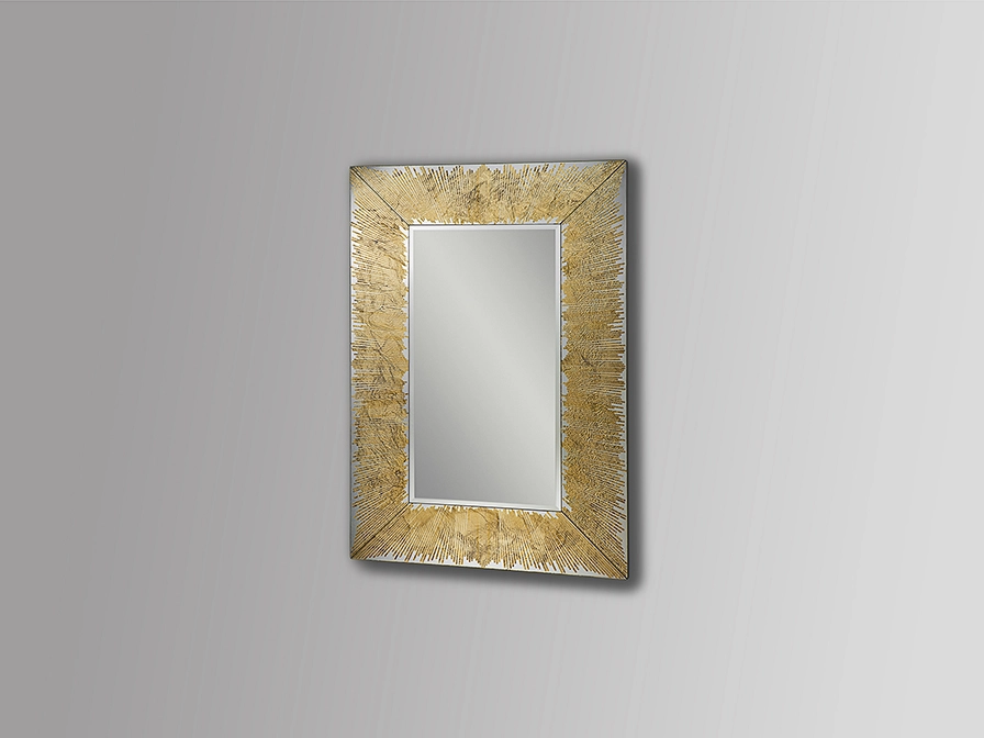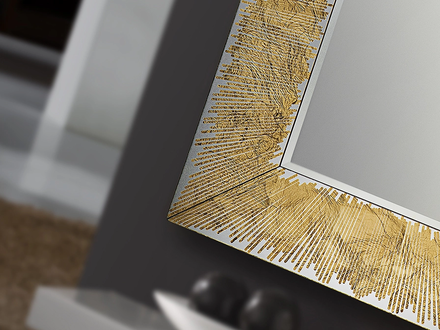 Espelho com lua central biselada e moldura de vidro com grafismo em folha de ouro.