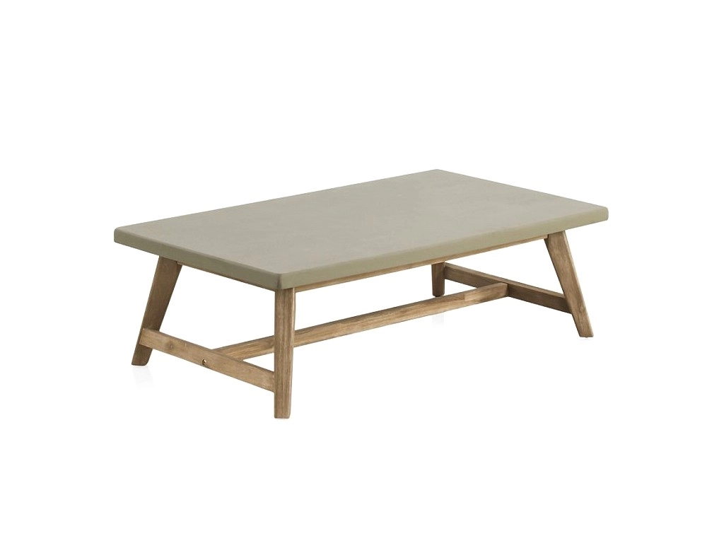 Mesa de centro em madeira de acácia com acabamento ligeiramente patinado.