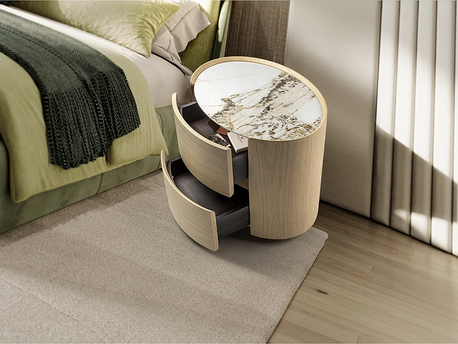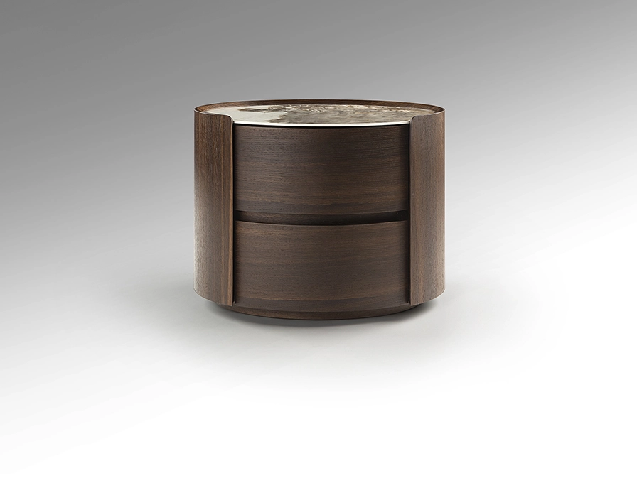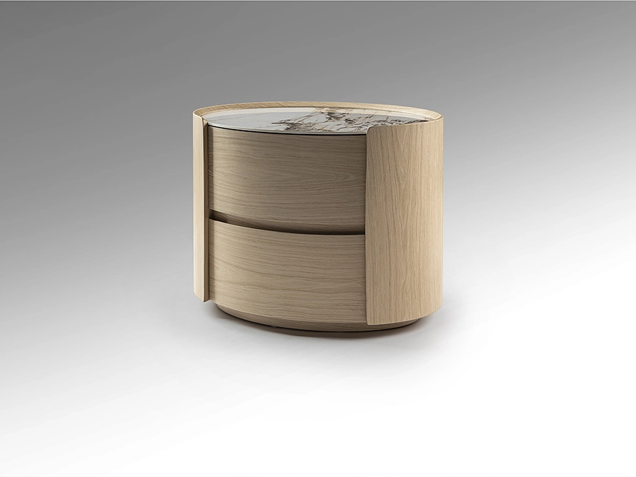 Mesa de cabeceira oval, com duas gavetas. Fabricada em carvalho claro ou escuro.