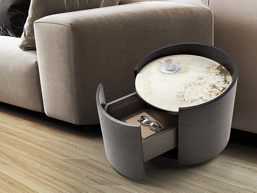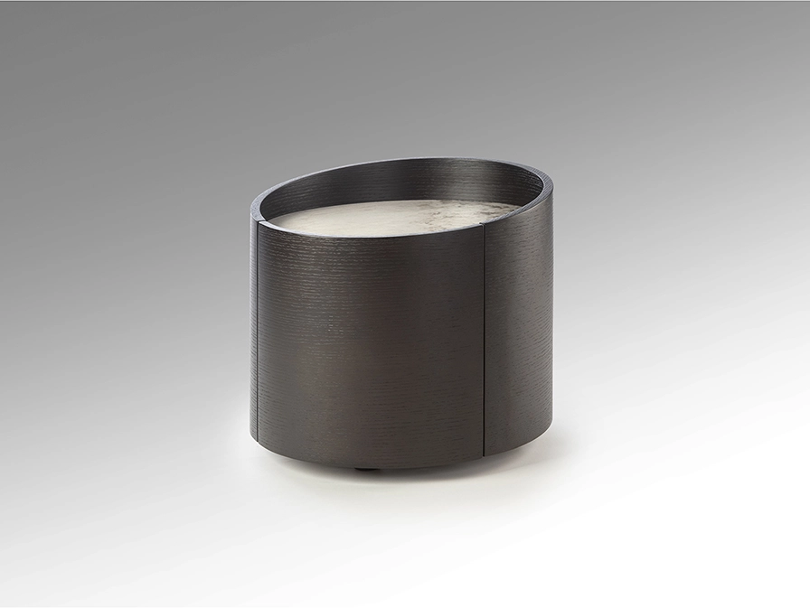 Mesa de cabeceira redonda, com uma gaveta. Fabricada em carvalho, acabamento preto.