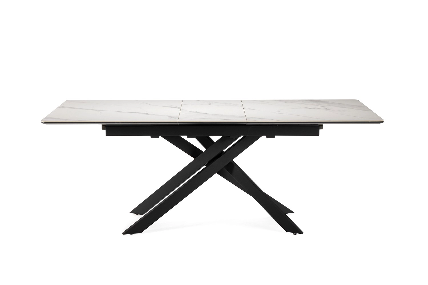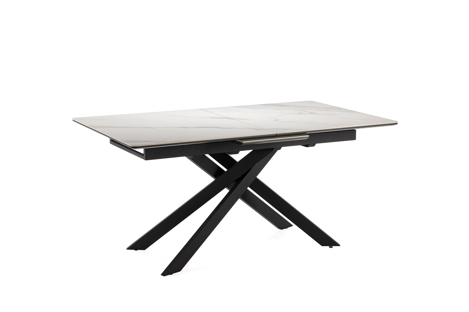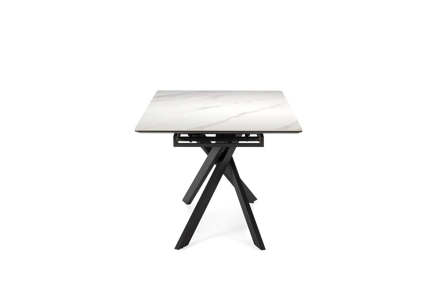 Mesa com o tampo cerâmico branco mate com veios cinza.