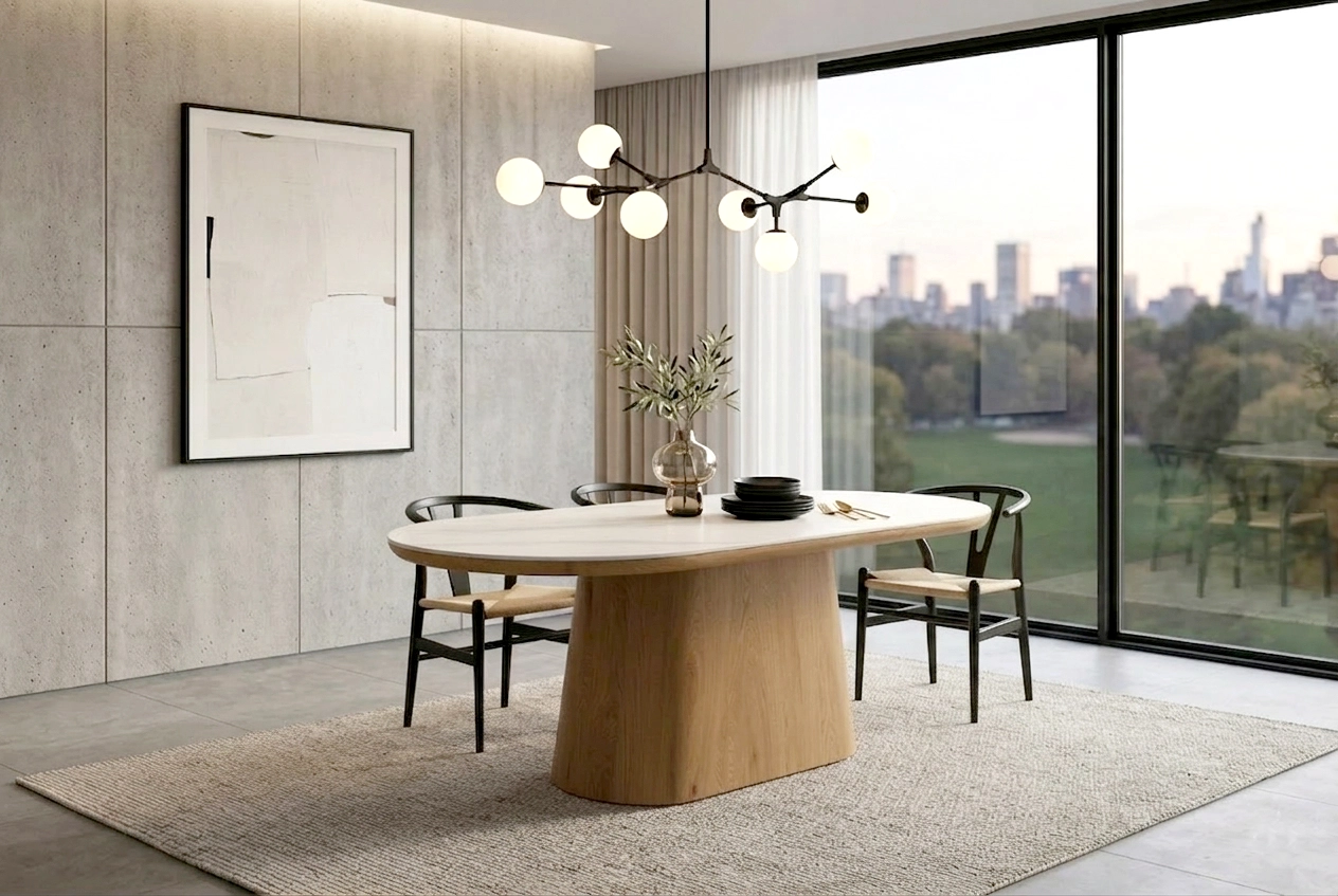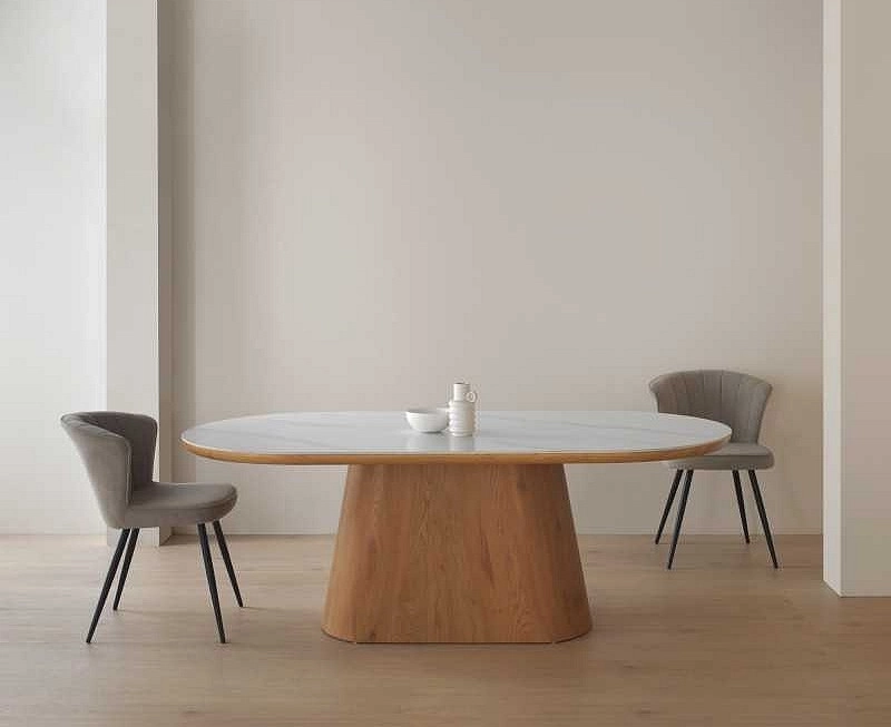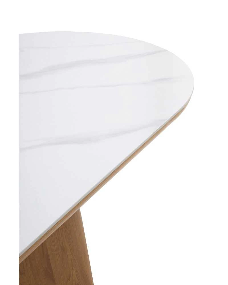 Mesa oval com tampo de cerâmica calacatta branca de 1 cm de espessura.