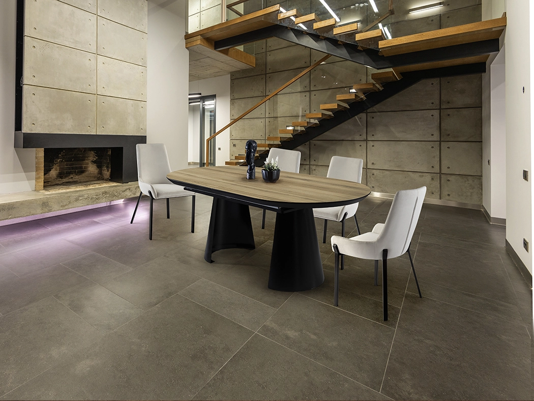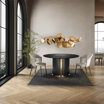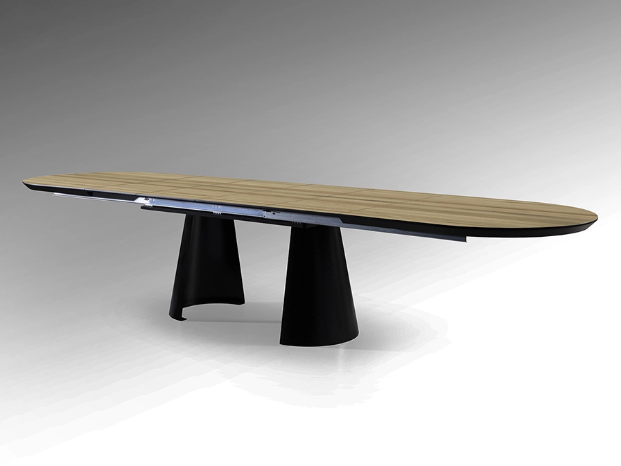 Mesa de jantar extensível, realizada em metal, acabamento preto mate e tampo de melamina de alta resistência, acabamento madeira, com cantos em preto mate.