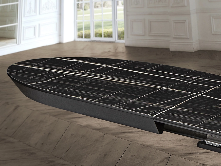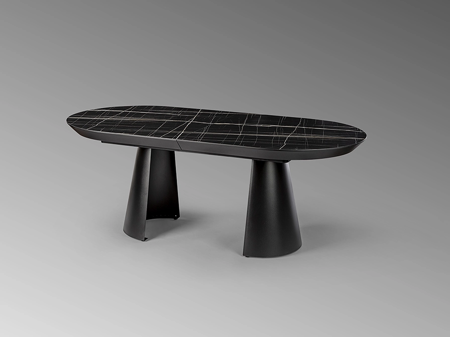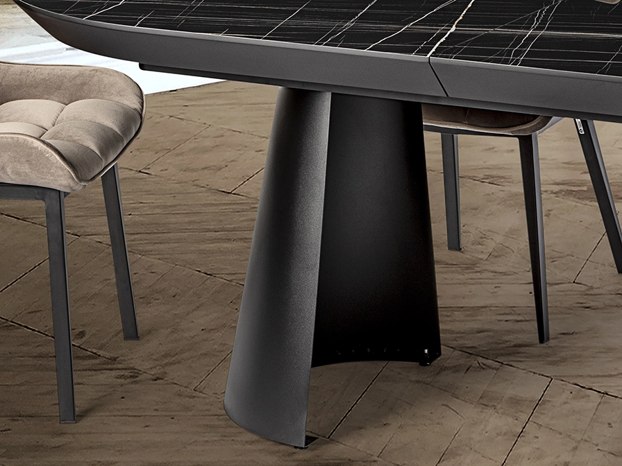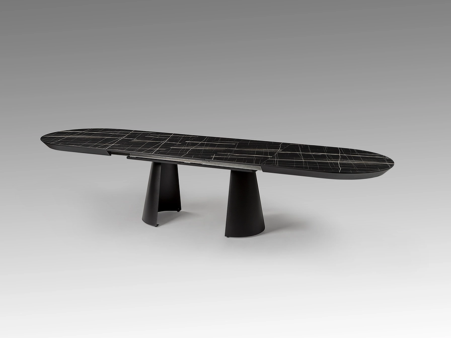 Mesa de jantar extensível, realizada em metal, acabamento preto mate e tampo de melamina de alta resistência, acabamento mármore preto brilho, com cantos em preto mate.