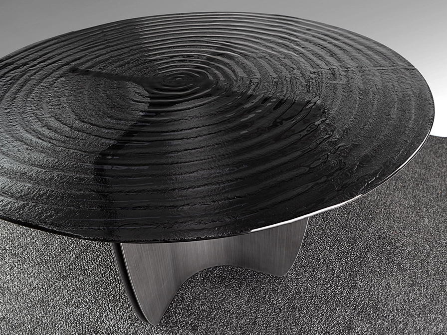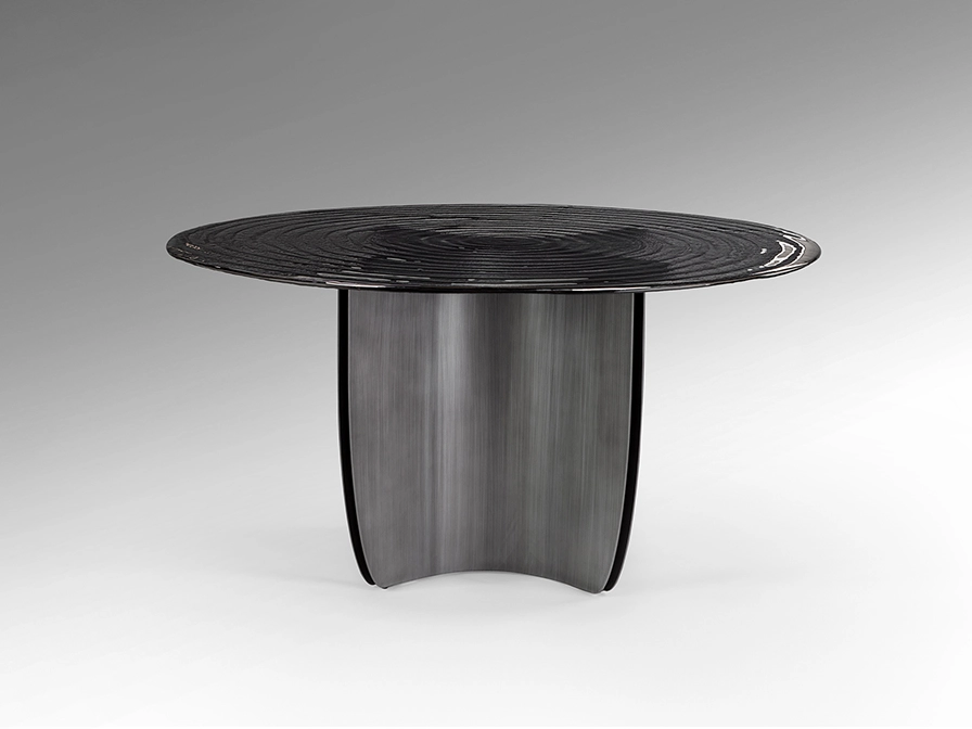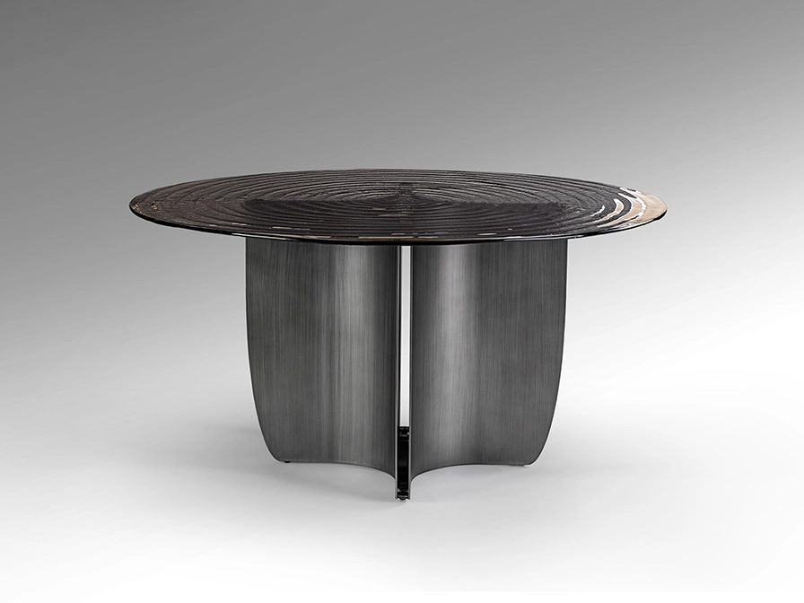 Mesa de sala de jantar redonda, fabricada em metal, acabamento cinzento chumbo patinado. Tampo de vidro termomoldado cinzento, superfície com textura de ondas concêntricas.